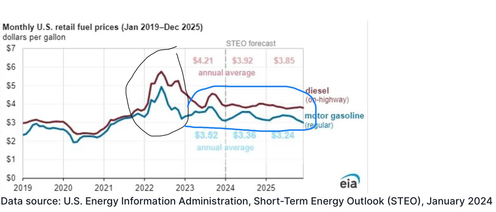 Gas prices peaking in 2022, then quickly dropping over 2022 through early 2023 (black).